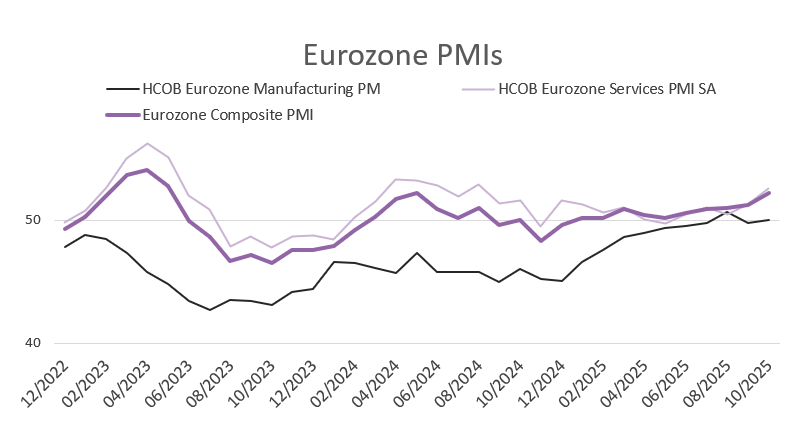 PMIs were a harbinger of good news in the Eurozone, with the composite rising to 52.2 in October, surpassing expectations of 51.0, to reflect the sharpest expansion in private sector activity since May 2024. The forward-looking new orders sub-index accelerated, with strong support from domestic clients, offsetting a fresh drop in export business.