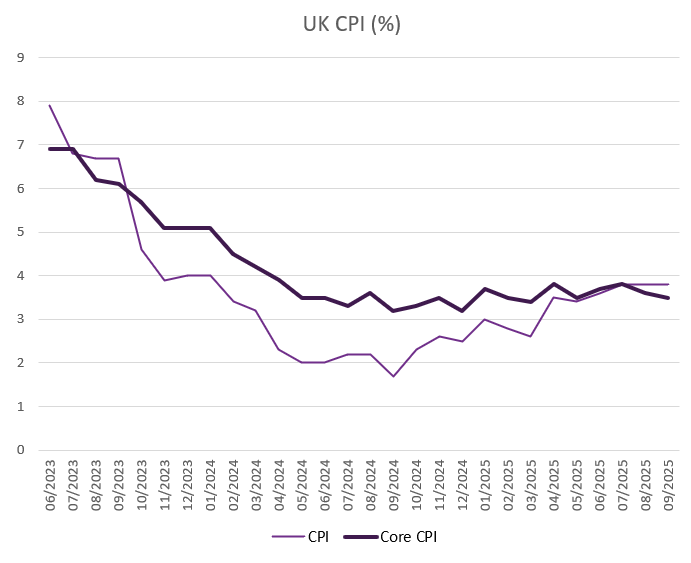 Consumer prices in the UK held steady at 3.8% in September, below the expected 4% by both analysts and the Bank of England, as lower prices for food and non-alcoholic beverages offset rises in other categories. Transport prices rose by 3.8%, driven by higher costs for motor fuels and air fares. Core inflation, which excludes volatile categories such as food and energy, unexpectedly slowed to 3.5% from 3.6% in August.