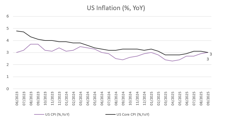 US CPI rose by less than expected in September, coming in at 3.0% YoY, versus 3.1% expected. The uptick was driven by a bump in energy prices, which rose the most since May. To some extent, policymakers can look through that, as falling crude prices have already manifested in lower prices at the pump through October. Importantly for the Fed, core inflation, which excludes food and energy, slowed to 3% from 3.1% in August.