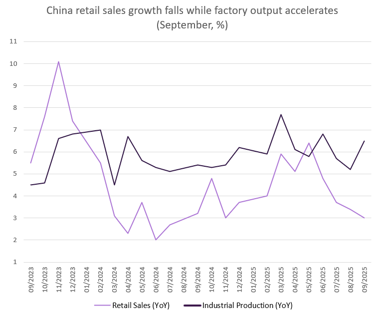 China’s GDP grew by 4.8% year-on-year in the third quarter of the year, down from 5.2% in Q2. Consumption remains weak, with retail sales growing at the slowest pace in a year (3% compared to 3.4% in August) in September, despite ongoing consumer subsidies. Consumers spent less on household appliances and audio-visual equipment (3.3% vs 14.3% in August), gold, silver and jewelry, among others. Sales increased at a faster pace for items such as grain, oil, and food, clothing, cosmetics and communication equipment. The job market also remains a main concern for consumers. Although the unemployment rate fell slightly from 5.3% to 5.2% in September, it remains close to the six-month high recorded in August.