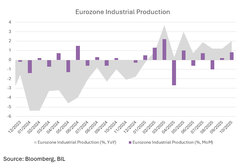 Industrial production in the Eurozone grew 2% YoY in October, or 0.8% from the previous month, suggesting activity is bottoming out after a string of misfortune.