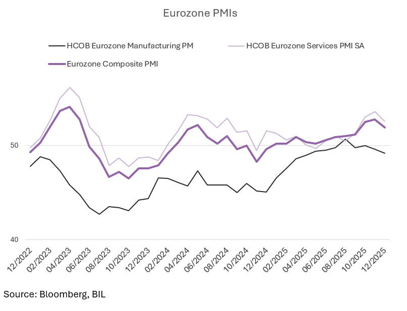The composite PMI fell to 51.0. While this is the lowest level in three months, it still points to expansion and decent Q4 growth overall. The composite PMI has been above fifty for the past 12 months, meaning that private business activity in the Eurozone enjoyed a full calendar year of expansion in 2025, for the first time since the pandemic.