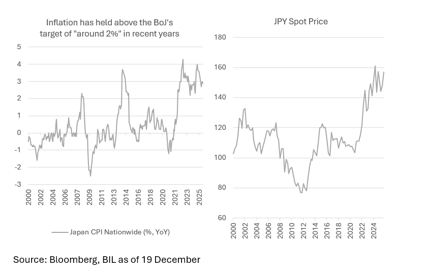 In a unanimous decision, the Bank of Japan raised its benchmark interest rate by 25 basis points to 0.75% at the tail-end of last week, while signalling that its hiking cycle will continue – if its economic outlook is realised. The likelihood of that happening has increased, according to the BoJ, given solid wage growth and receding risks from US tariffs. After years of feeble prices pressures, inflation has held above the BoJ’s target of “around 2%” since 2022.