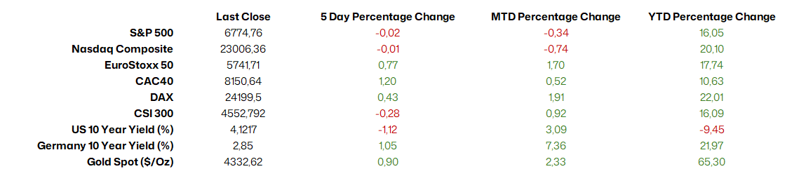 After a slight stagger early Friday, a Santa rally in stocks looked to be taking hold on Friday afternoon. A lower-than-expected US inflation print (2.7% YoY versus forecasts of 3.1%) allowed the merry vibes that set in with the Fed’s 25bp rate cut to persist, while the expiration of around $7.1 trillion in options also helped lift stocks, as it compelled traders to rollover positions or open new ones. Across the week, US equities saw near-record inflows, with the prospect of tax cuts next year stoking interest. Notably, flows into US tech stocks picked up, implying that fears about AI valuations have been somewhat allayed for the time being. Positive news and guidance from some household tech names helped. Bond yields rose virtually across the board after the Bank of Japan hiked rates by 25 basis points, to the highest level since 1995, while signalling more tightening on the horizon.