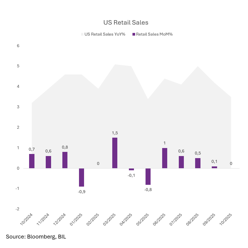 The key risk is that a weakening labour market derails consumption – the key growth engine of the US economy, accounting for roughly two-thirds of all economic activity. Headline retail sales stagnated in October. However, control group sales (which exclude food, gasoline, auto dealers and materials stores and which are used to calculate GDP), surged 0.8%.