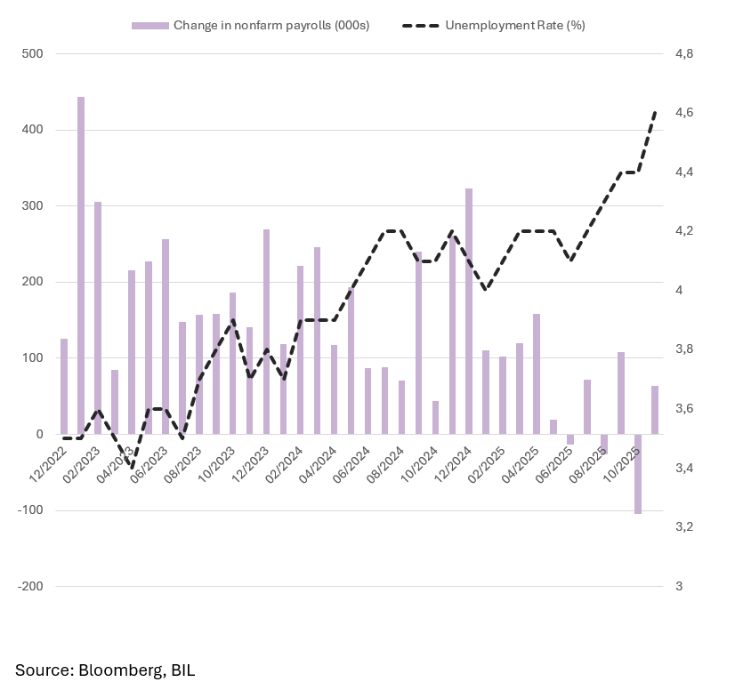Delayed data on the US labour market kept hopes about future Fed easing alive, with the unemployment rate rising to a four-year high of 4.6% in November, from 4.4% in September. Nonfarm payrolls grew by 64K during the month, failing to compensate for a 105K loss in October, and with most of the gains concentrated in healthcare and construction. Government positions continue to decline.