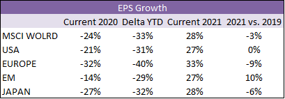 As mentioned previously, with government bond yields set to be lower for even longer, investors need to accept more risk in search of return, meaning that equities, despite an expensive valuation, should not be ruled out completely (we keep a neutral stance). On the shorter term equities are supported by the steady improvement in economic numbers, which have bottomed out from the recession levels seen during the lockdown. Even though earnings expectations for 2020 have fallen of a cliff (earnings growth is expected to be around 30% lower than in 2019) the positive momentum could keep on moving markets – so long as no second wave of the pandemic materialises, economic numbers improve and more and more countries loosen lockdown restrictions. As this is not a recession caused by an economic downturn or imbalances (rather it is man-made on the back of the lockdown), investors are more optimistic with regard to the rebound of the economy and company earnings. From history we know that on average it takes 4 years before earnings return to pre-recession levels. Markets expect that we will be back around 2019 levels by next year already. This is largely supported by announced emergency packages far greater than those we saw in the aftermath of the Great Financial Crisis in 2008. The difference from previous recessions is that emergency packages this time around have less focus on tax relief and infrastructure spending and more on job security and loan guarantees to limit bankruptcies. Although these have a positive effect on the economies, they do not serve as a direct growth driver to company earnings (as does tax relief and spending).