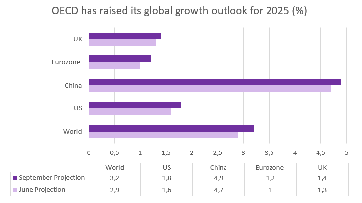 Given that growth in the first half of the year was stronger than expected, the OECD has revised its growth outlook for the years ahead. The global economy is now expected to slow only slightly to 3.2% in 2025 compared to the 2.9% forecast in June. However, growth in 2026 is still expected to slow to 2.9%, in line with the June forecast, as some of the factors that helped growth exceed expectations this year begin to fade.