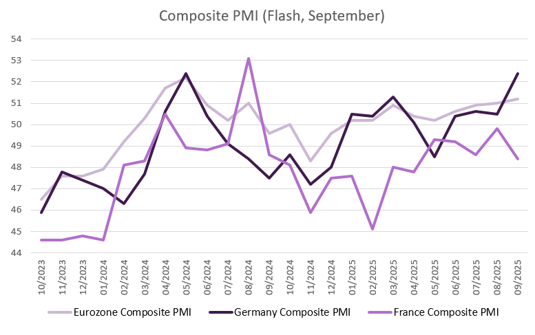 According to preliminary estimates, business activity in the Eurozone expanded at its fastest pace for 16 months in September, with growth in the service sector offsetting the contraction in manufacturing. The Composite PMI increased to 51.2, up from 51.0 in August. The expansion was driven by services, with the PMI climbing to 51.4 in September from 50.5. It marks the strongest growth this year and was supported by an improvement in new orders. Firms also reduced backlogs of outstanding orders at the fastest rate in three months. However, the manufacturing sector fell back into contraction in September, with the PMI falling to 49.5, after rising above the growth threshold of 50 in August. This renewed downturn was driven by a sharp drop in new orders and slower output growth.