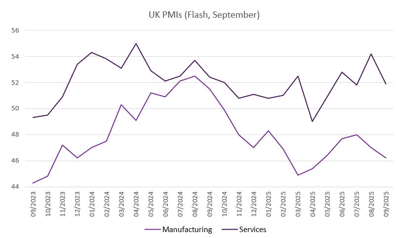 On a country-by-country basis, the PMI survey showed a sharp divergence between the bloc’s two biggest economies. Germany registered solid growth, with the composite PMI jumping to 52.4 in September — the highest reading since May 2024. The improvement in business activity was driven by the services sector, which rebounded from a contraction in August. Meanwhile, the contraction in manufacturing worsened. In France, business activity declined for the thirteenth consecutive month, with the composite PMI standing at 48.4. Both services and manufacturing activity contracted. Services saw sharper output falls, while manufacturing suffered from weak demand. Heightened political uncertainty has contributed to weaker client demand.