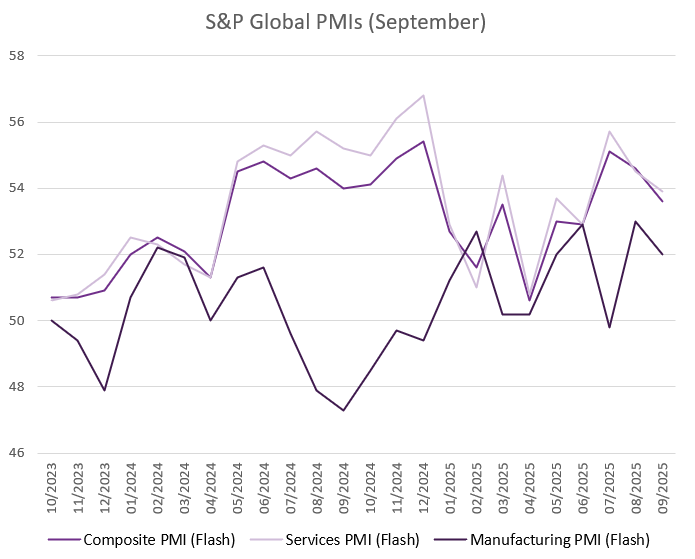 US firms seem to be absorbing most of the tariff costs for the moment, as weak demand and rising competition are making it difficult to pass on increased costs to consumers. According to preliminary estimates, business activity moderated in September, with the Composite PMI falling from 54.6 in August to 53.6. This marks the second consecutive month of falling activity, with both the services and manufacturing sectors slowing to 53.9 and 53, respectively. Input costs reached their highest level since May, largely due to tariffs, while output costs increased at their slowest pace since April, as companies struggle to raise prices. New orders in both industries slowed, and slower-than-expected sales led to a sharp rise in factory inventories of unsold goods.
