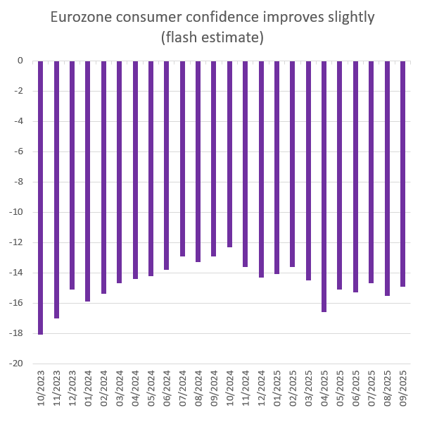 Looking to the bloc’s consumers, confidence remains muted. After falling to a four-month low in August of -15.5, consumer confidence in the Eurozone rose to -14.9 in September. While concern over trade tariffs and fiscal policies in Europe remain, lower borrowing costs and easing inflation in recent months led to a slight improvement in confidence.