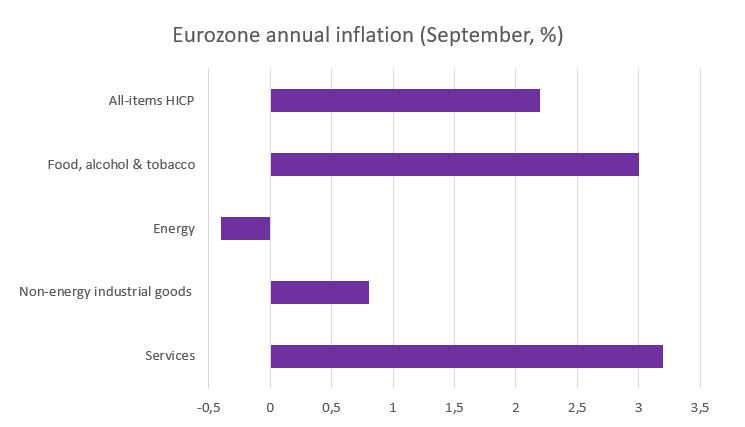 According to flash estimates, consumer prices in the Eurozone rose slightly, to 2.2% year-on-year in September, up from 2% in August. The increase was mainly driven by higher prices for services and food, alcohol and tobacco. It marked the first rise above the ECB’s 2% inflation target since April and was in line with analyst expectations. The slight increase in the annual inflation rate is unlikely to cause major concern for the central bank, which expects inflation to fall to 1.7% next year and remain below the target level throughout 2027.