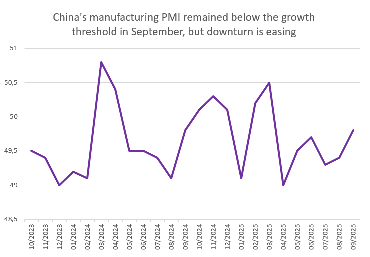 China’s factory activity contracted for the sixth straight month in September, according to the National Bureau of Statistics. The manufacturing PMI rose to 49.8 in September, from 49.4 the month prior. Although it continues to be below the growth threshold of 50, the pace of decline was the slowest since before US President Trump announced his “reciprocal” tariffs in April this year. Output grew at the strongest pace since March, and buying levels rose. Meanwhile, new orders, foreign sales and employment continued to decrease, albeit at a softer pace. The improvement comes as manufacturers anticipate more policy support from the government following the October plenum, during which the communist party will meet to map out the country’s social and economic development over the next five years.