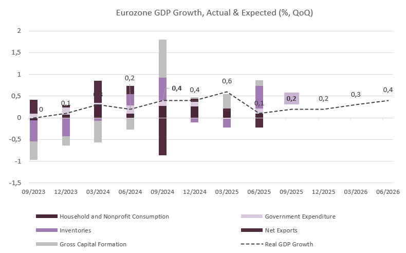 A flash data release on Thursday showed that the Eurozone economy expanded by 0.2% QoQ in the third quarter, up from 0.1% in Q2 and slightly above market expectations of 0.1%. Despite political turbulence, the French economy surpassed expectations, registering growth of 0.5%, driven by a sharp rise in exports and robust domestic demand. Spain remained the best performer among the bloc’s largest economies, expanding 0.6% as expected, supported by strong household consumption and fixed investment. Germany stagnated due to a decline in exports.