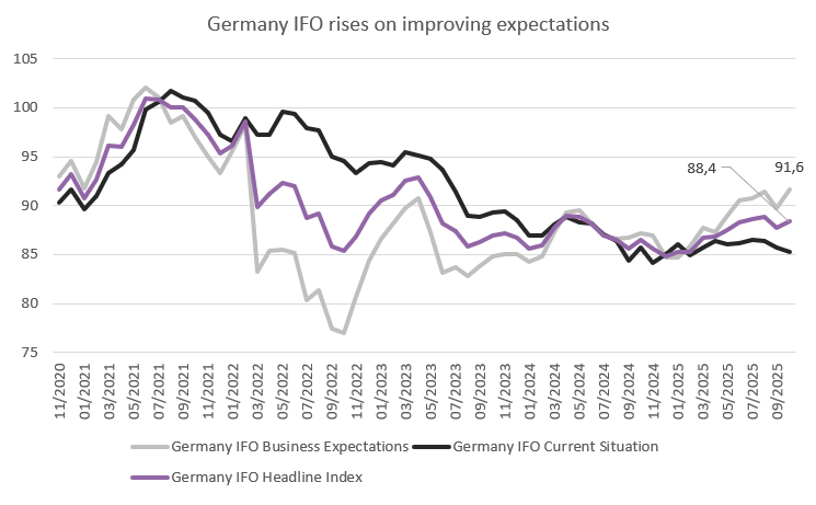 Zooming in on the bloc’s largest economy, the latest IFO index suggests that German businesses are starting to grow more optimistic about the future. While perceptions about the current situation slumped for a third consecutive month, expectations hit their highest level in more than three years.