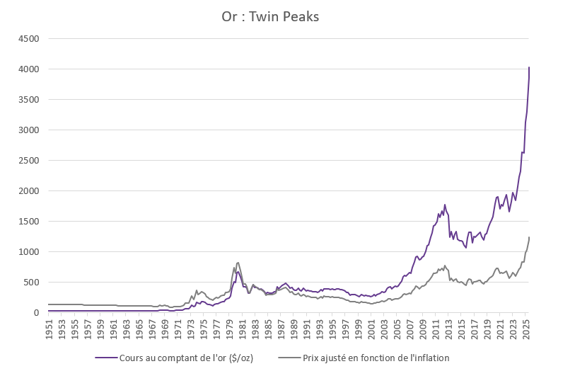 Une combinaison de forces, à la fois éphémères et fondamentales, a propulsé l'or vers de nouveaux sommets historiques cette année, dépassant les 4 000 dollars l'once troy la semaine dernière. Et les records ne s'arrêtent pas là : pour la première fois en 45 ans, l'or a également dépassé son pic ajusté en fonction de l'inflation. Depuis le début de l'année, le métal précieux a enregistré des gains de plus de 50 %, surpassant largement le S&P 500 (en hausse d'environ +13 %), le NASDAQ (environ +18 %), le Bitcoin (+20 %) et la plupart des superstars de l'IA. La question qui se pose désormais aux investisseurs est de savoir si l'or peut continuer à briller.