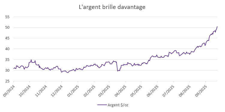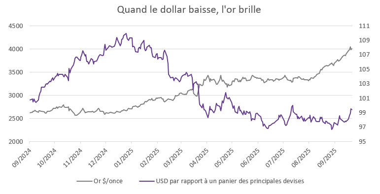 Cela dit, la reprise n'est pas sans risques. Un rebond soudain de l'inflation pourrait inciter la Fed à réaffirmer sa position restrictive, ce qui ferait remonter les rendements réels et renforcerait le dollar, deux facteurs traditionnellement négatifs pour l'or. Depuis la mi-septembre, le dollar a regagné près de 3 %, ce qui rappelle que le sentiment peut changer rapidement.