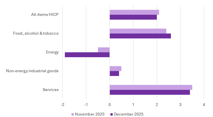 The price growth of services and non-energy industrial goods slowed, while energy prices fell more sharply. Meanwhile, prices for food, alcohol and tobacco rose slightly. Services inflation is a closely watched indicator of price pressures, and while it remains well above the ECB’s target, the easing in December is a positive sign.