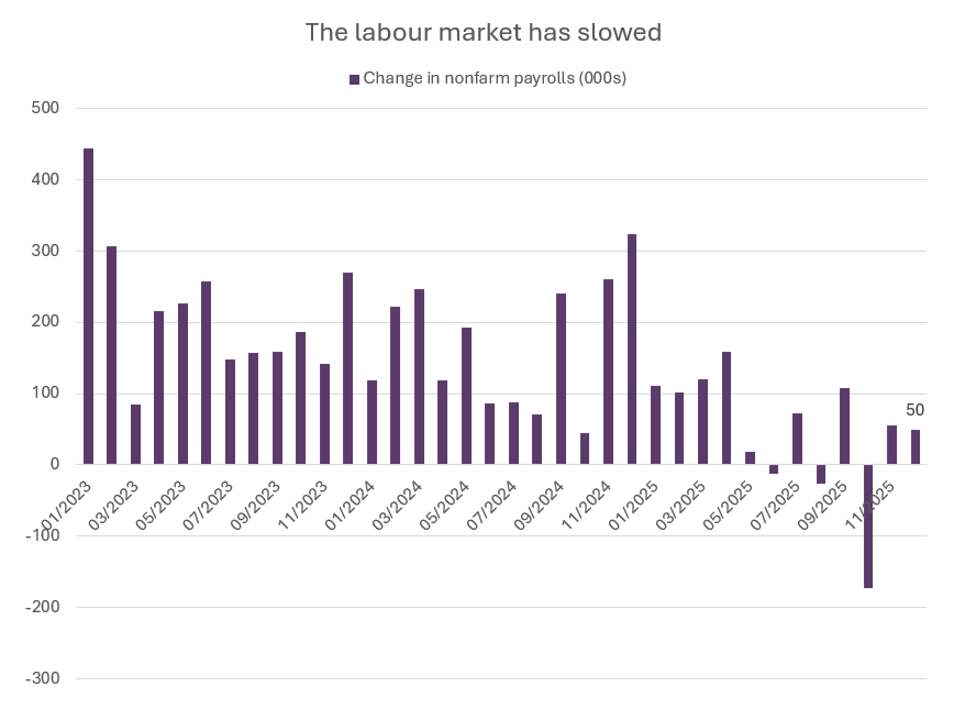 With some mixed signals coming from the US labour market, but unemployment nevertheless easing, the Fed is likely to pause monetary easing at the start of the year, before continuing to cut rates further as the year progresses.