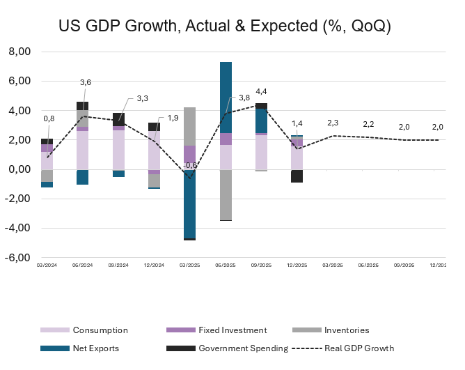 Growth slowed by more than expected as the government shutdown caused government spending and investment to contract sharply (5.1% vs 2.2%), and consumer spending moderated. Consumer spending continued to be driven by upper-income households, while lower-income households struggled with an affordability crisis. This was offset by a rise in fixed investment, driven by strong gains in intellectual property products. Trade also had a negative impact on growth in the last three months of the year, with US trade deficit jumping in December.