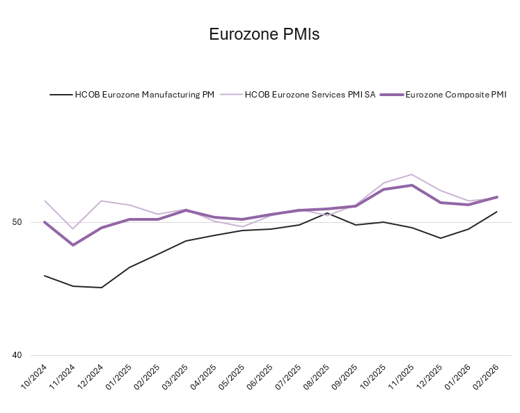 According to preliminary estimates, business activity in the Eurozone was boosted in February, with the composite PMI rising from 51.3 in January to 51.9, surpassing expectations of a slower expansion. This marks the strongest expansion in private-sector activity since November, driven by the sharpest rise in manufacturing output since August 2025 and faster growth in services.